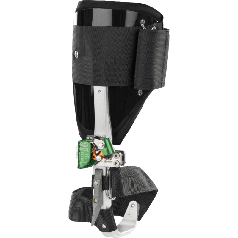 This support enables the user to ascend a rope while wearing the tree climbing spikes/spurs. This speeds up the maneuvers because the user avoids having to continually take off and put back on the spurs to switch from the tree climbing mode to the rope climbing mode. The position of the locking cam can be easily adjusted in both directions according to the needs of the user.