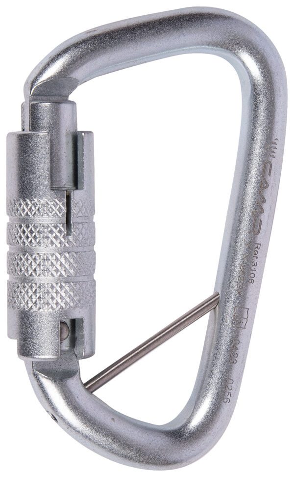 High strength steel carabiner equipped with removable anti-rotation pin.