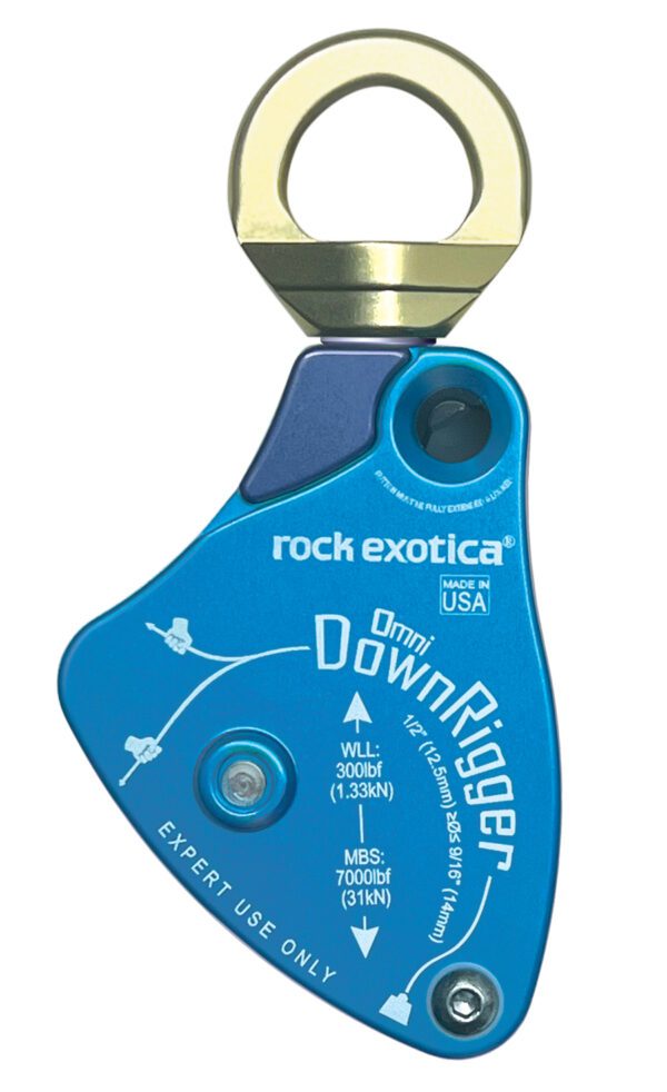 The DownRigger applies friction to the rigging line when weighted by the load, allowing the operator to control the descent by hand. Unweighted, the line pulls easily back through the device to reset the system. The DownRigger features the well-known Rock Exotica swivel top that allows for easy alignment with the load, and the double-locking side plate that makes rope installation more efficient.