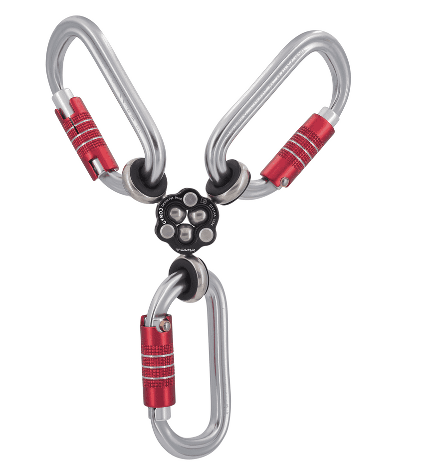 The Gyro3 rotates at all three connection points which allows for countless possibilities of connection between different elements that need freedom of movement. Just a few possibilities include: self-orienting multi-anchoring, multiple connections to a harness, preventing twisting in Y lanyards, cross-hauling operations, Tyrolean traverses, complex rescue procedures. The innovative design also prevents the accumulation of dirt and makes inspection easy. Main structure is carbon steel with a double corrosion preventive coating. Swivel balls and attachment points are stainless steel.