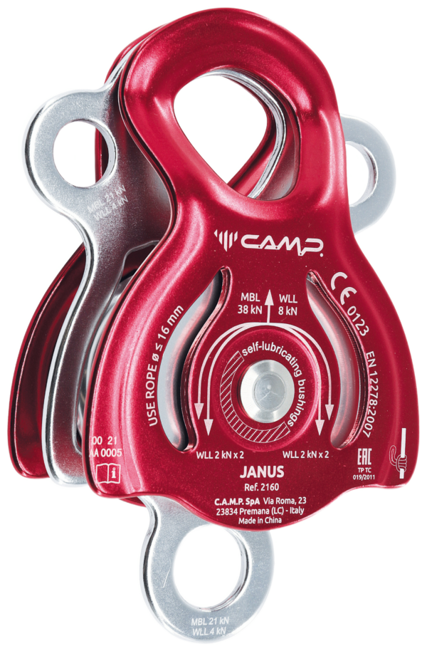 A high strength multifunctional double pulley for block-and-tackle systems and complex operations.