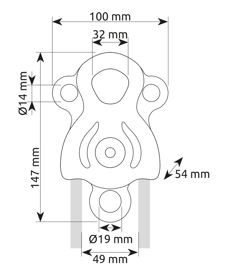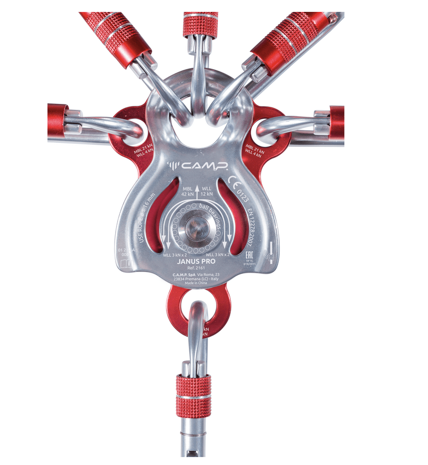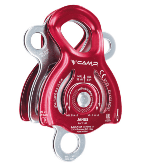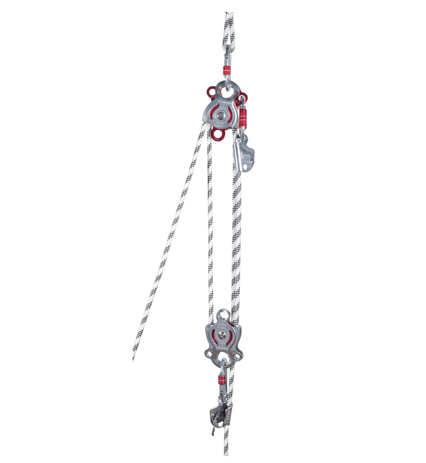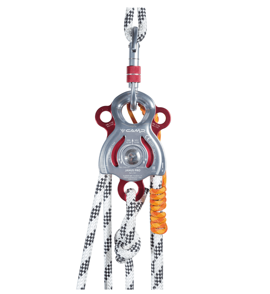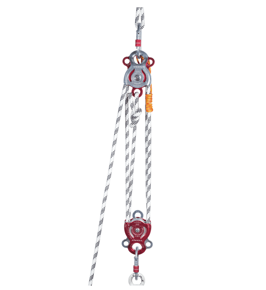 Features large wheels, a main attachment point that accommodates three carabiners, and a large becket with a large bottom attachment point and two secondary attachment points on the sides for linking, positioning and attaching progress capture systems. For use with ropes up to 16 mm. Prusik minding, the self-locking knot can be installed on both sides of both wheels. Self-lubricated bushings are sufficient for light applications at low speed.