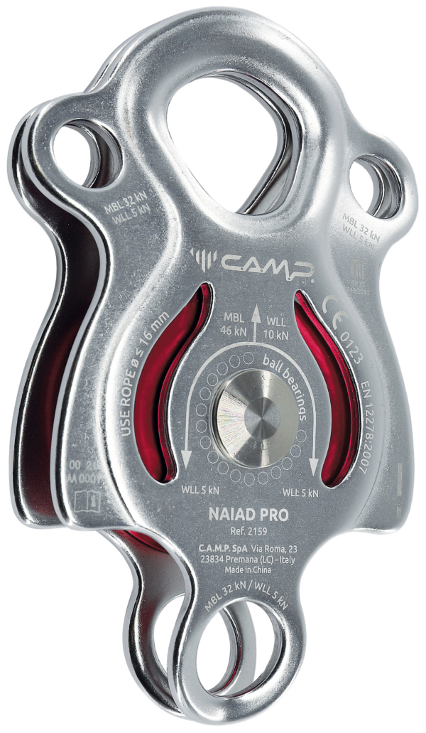 Features a large wheel, a main attachment point that accommodates three carabiners, a large bottom attachment point, and two secondary attachment points on the sides for linking, positioning and attaching progress capture systems. For use with ropes up to 16 mm. Prusik minding, the self-locking knot can be installed on both sides. Sealed ball bearings for high efficiency and intensive use at high speed.