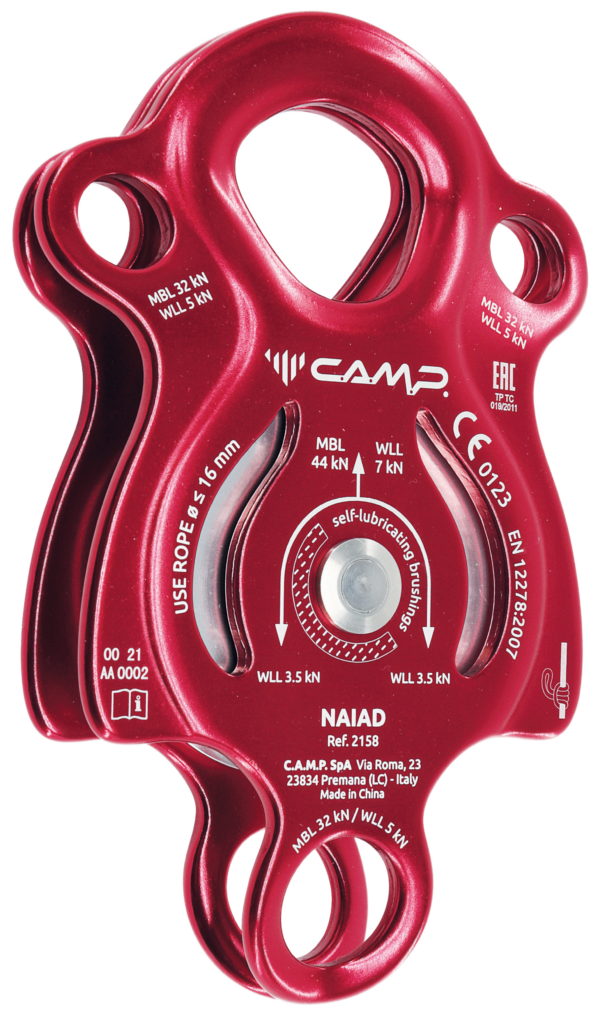 Features a large wheel, a main attachment point that accommodates three carabiners, a large bottom attachment point, and two secondary attachment points on the sides for linking, positioning and attaching progress capture systems. For use with ropes up to 16 mm. Prusik minding, the self-locking knot can be installed on both sides. Self-lubricated bushings are sufficient for light applications at low speed.
