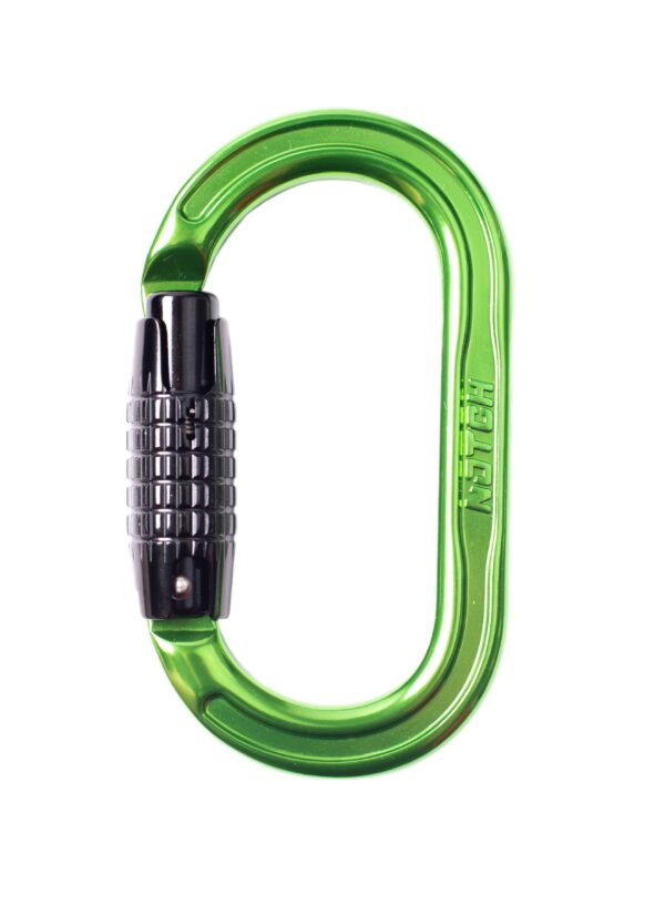 The Notch Absolute Oval Carabiner is anodized in a custom green color with black gate.