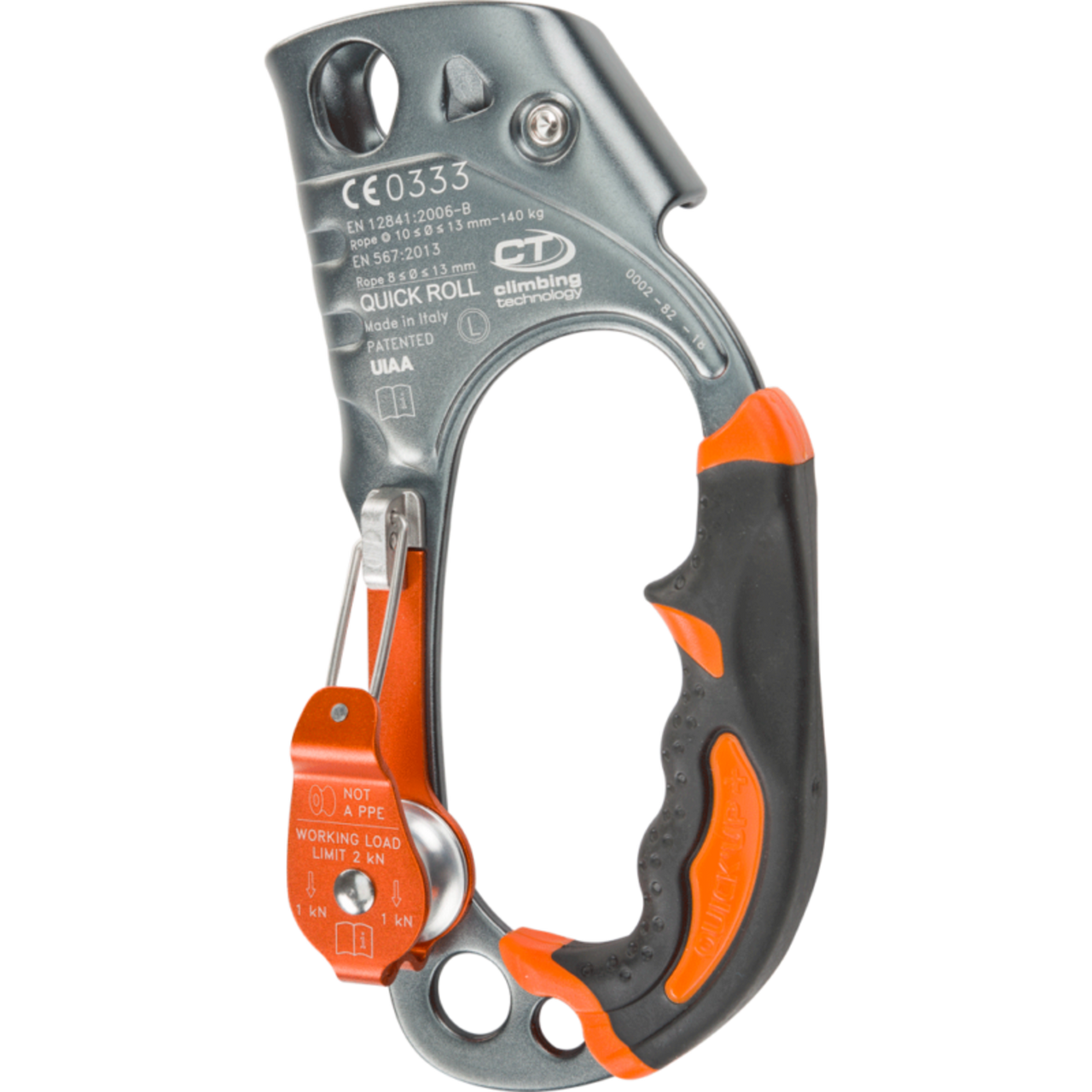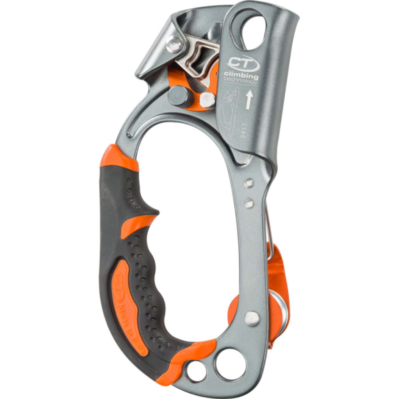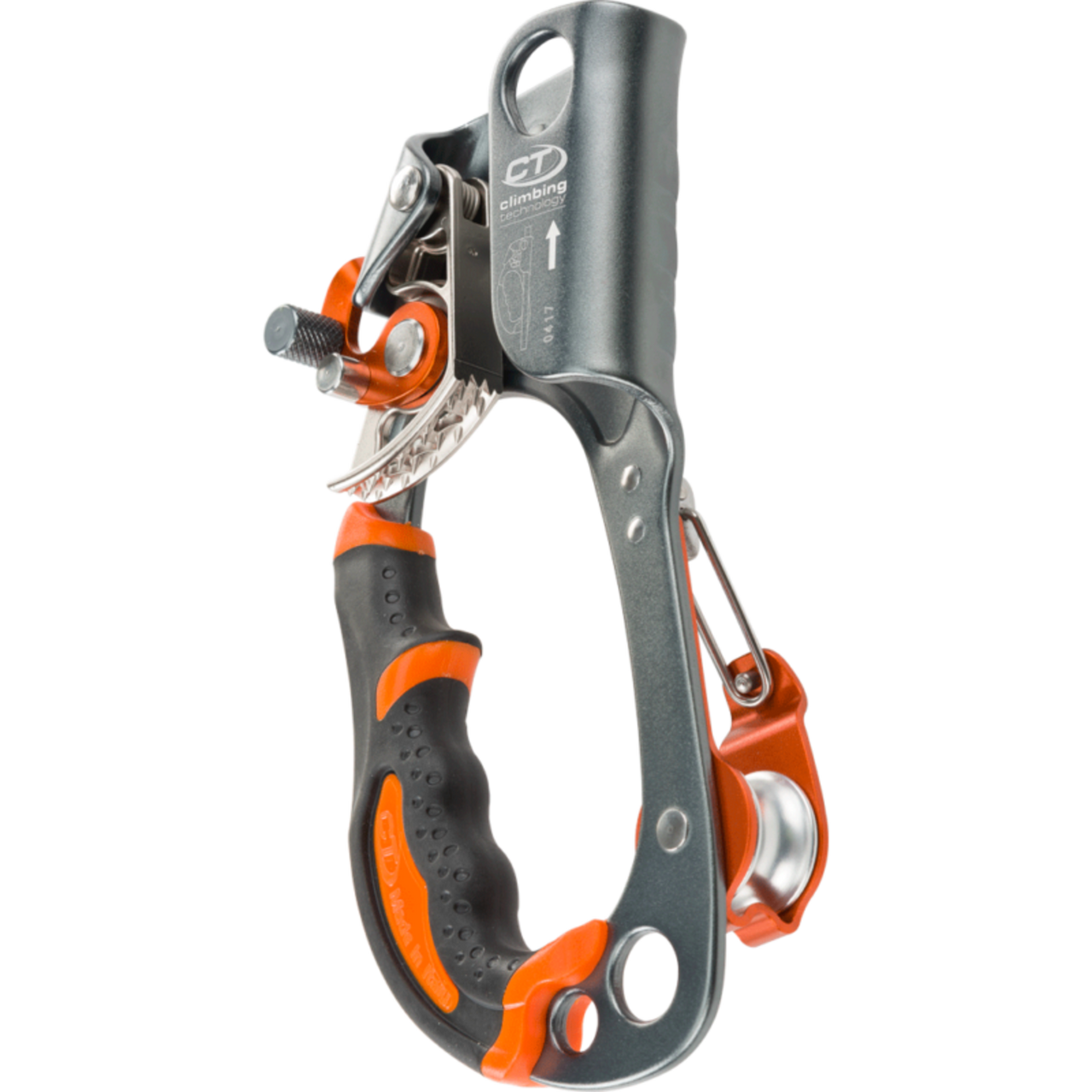 • wear-resistant steel blocking cam, with depressions to avoid the accumulation of dirt and mud and reduce force needed to slide device up the rope in difficult conditions (muddy, iced-up ropes);