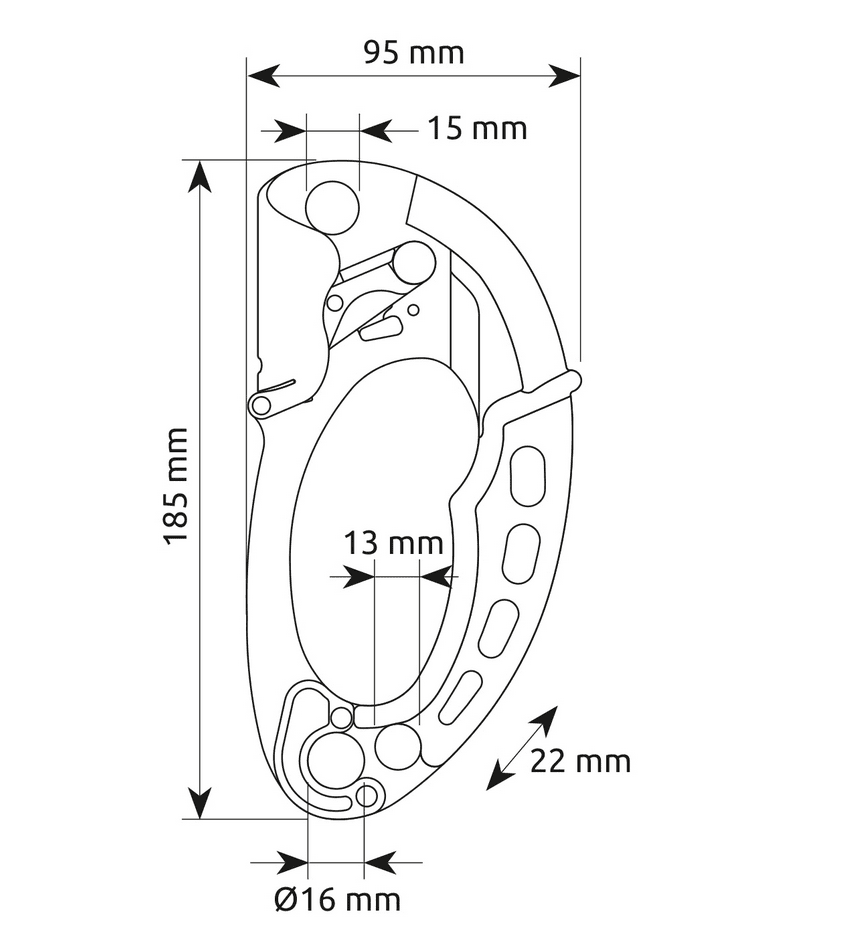 Features three large attachment points, two on the bottom and one at the top, for optimal organization. The stainless steel rope guide reinforces the main attachment point for increased resistance to wear and tear. It also prevents the carabiner from interfering with the rope. The robust body is constructed from 3.5 mm aluminum alloy. The geometry is verified for use on traverses. The toothed cam is finished with a special anti-wear treatment and features drain holes to help prevent the build up of mud and grit. The opening system is protected on both sides to prevent accidental openings. The proprietary roller also allows the Turbohand to be rigged as a locking pulley for light hauling with a max load of 50 kg, 110 lbs. NOTE: This configuration is not intended for hauling or securing of bodies.