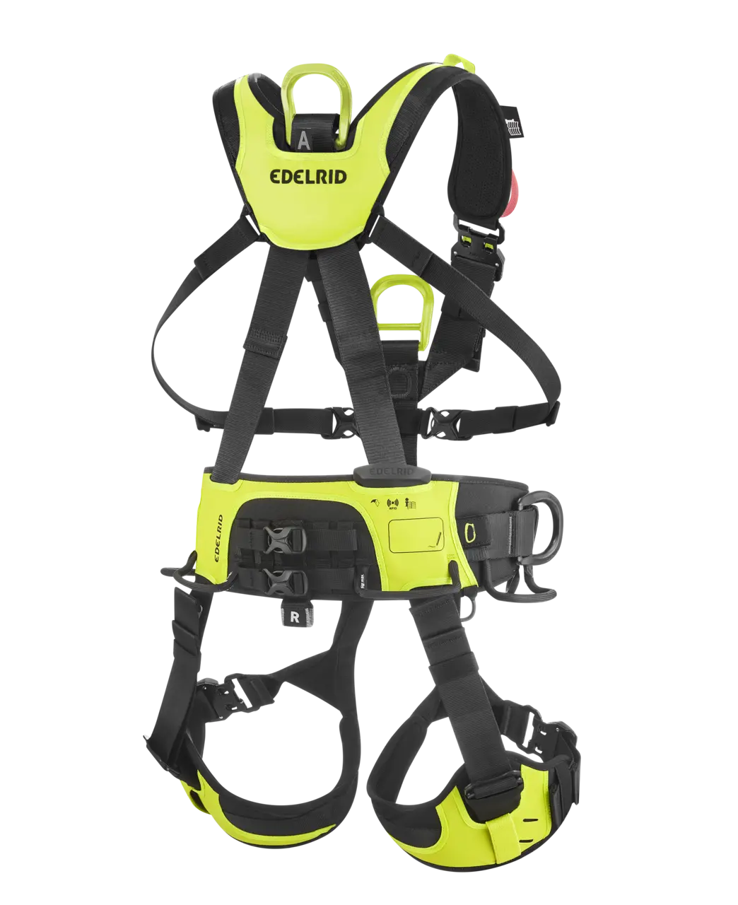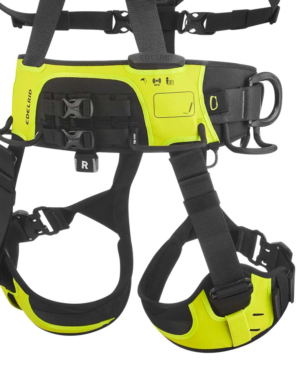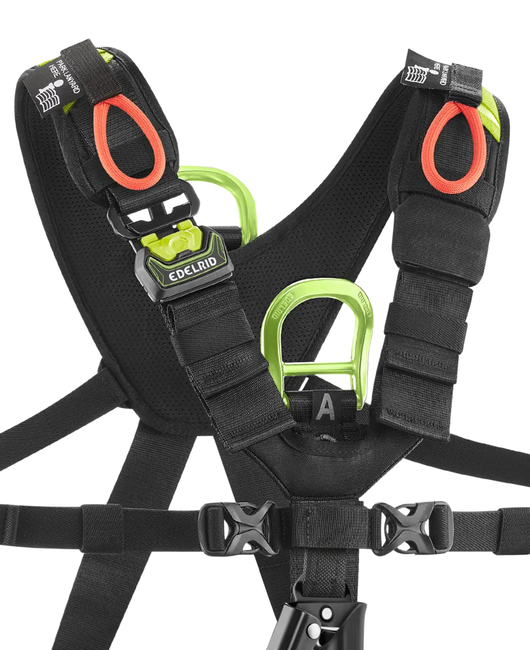 – Two loops on the chest harness for attaching a radio set or for accommodating a fall arrester